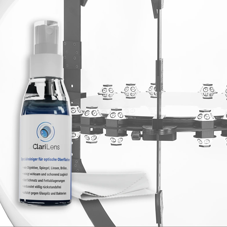 eigens von uns entwickelte Reinigungslösung an. Diese wurde speziell für die schonende Reinigung von empfindlichen, optischen Oberflächen konzipiert.