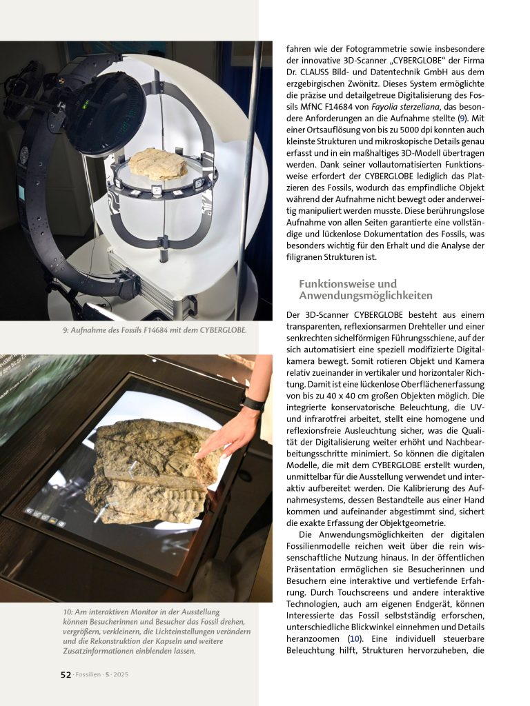 Mit dem CYBERGLOBE gelang die hochauflösende Dokumentation der morphologischen Merkmale, so dass nun eine berührungsfreie Begutachtung und Vermessung des Fossils möglich ist.