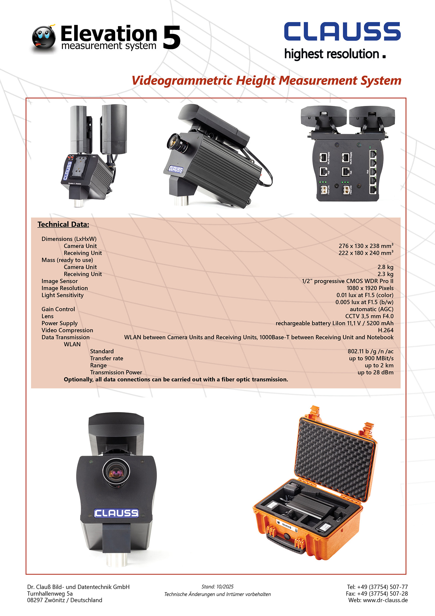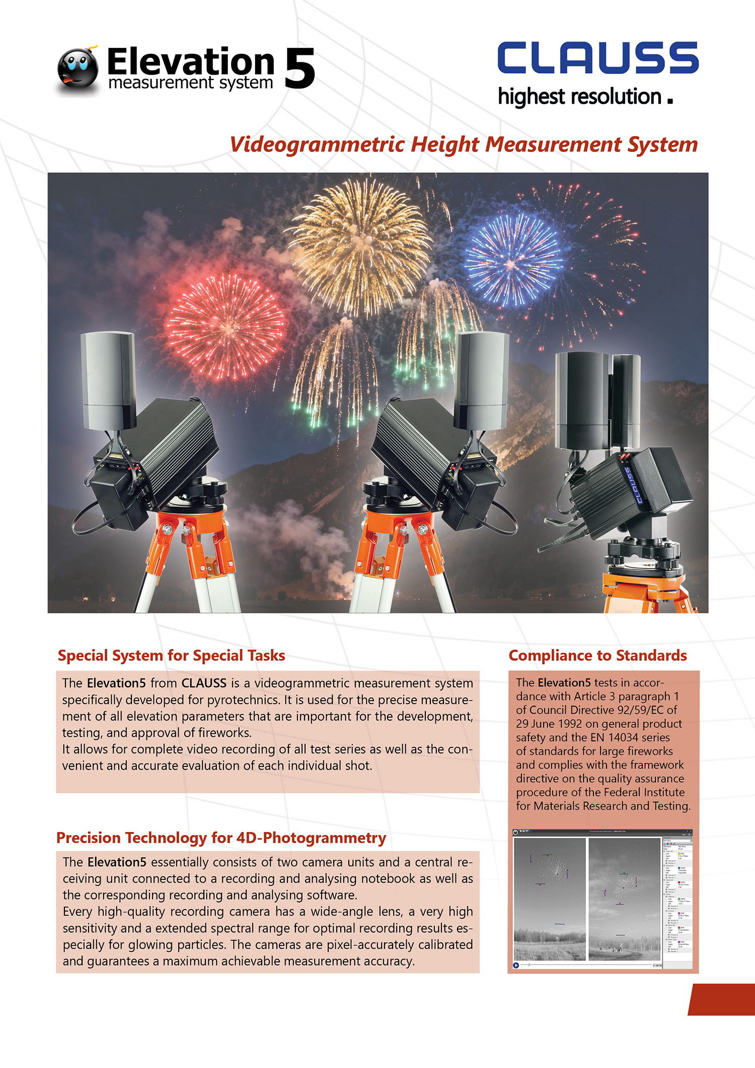 Das videogrammetrische Messsystem Elevation5 wurde speziell für Höhenmessungen von Feuerwerken entwickelt und erlaubt neben der vollständigen Videoaufzeichnung aller Testreihen auch die komfortable und korrekte Auswertung jedes einzelnen Schusses.